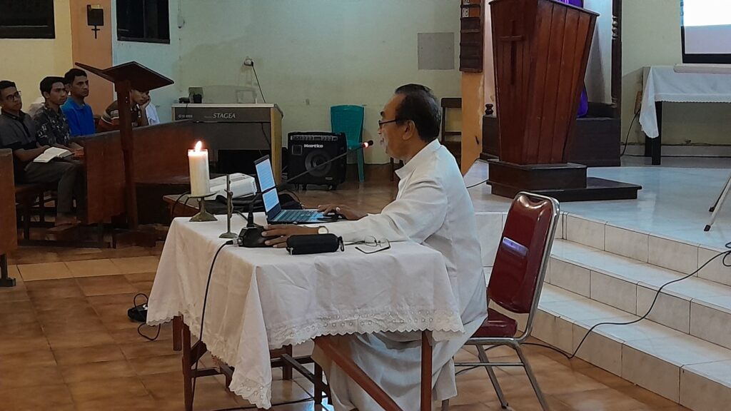 Mengawali rekoleksi, Romo Valens menyampaikan ungkapan belasungkawa yang tulus dan mengajak seluruh frater untuk menjaga ketenangan malam ini sebagai bentuk penghormatan dan doa bagi almarhum Mgr. Petrus Turang.
